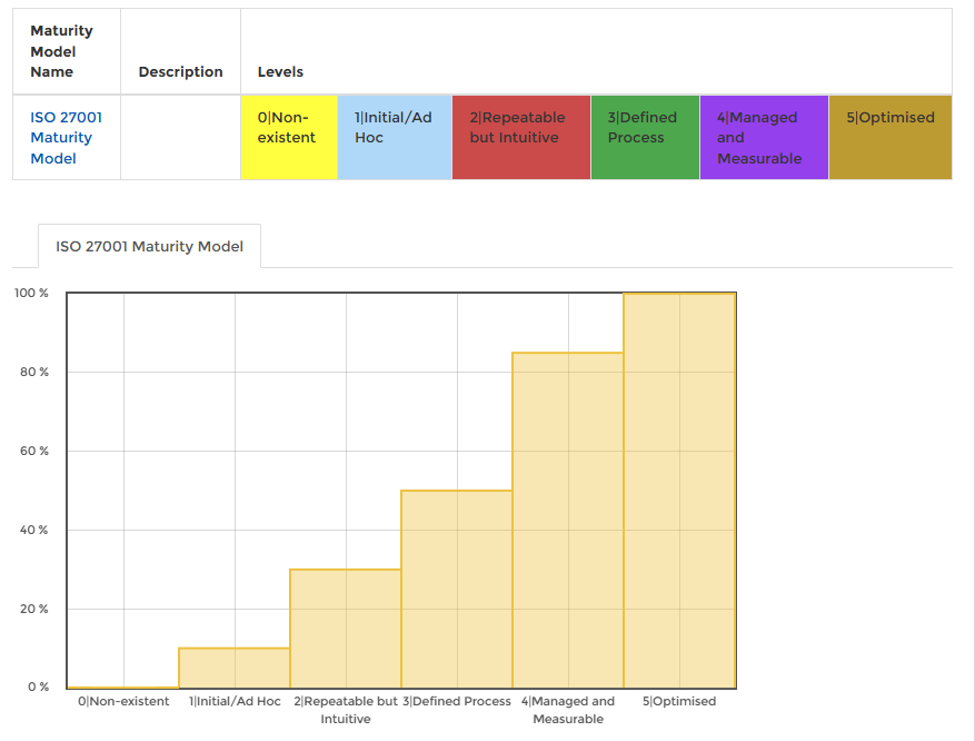 By default, Abriska comes pre-loaded with a maturity model that has been defined for ISO 27001. This maturity model is based on the industry Standard (Control Objectives for Information and related Technology (COBIT®) - IT Governance Institute). There are six levels within the maturity model ranging from level 0 (Non-existent) through to level 5 (Optimised) and each level as a defined effectiveness.