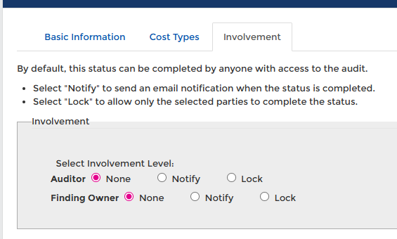 Auditors or Finding Owners are set up for each audit. It is possible to define whether roles need to be notified when the status is complete.