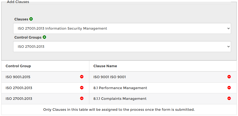 Once all the required controls are selected, the submit option must be taken to assign the clauses to the process.