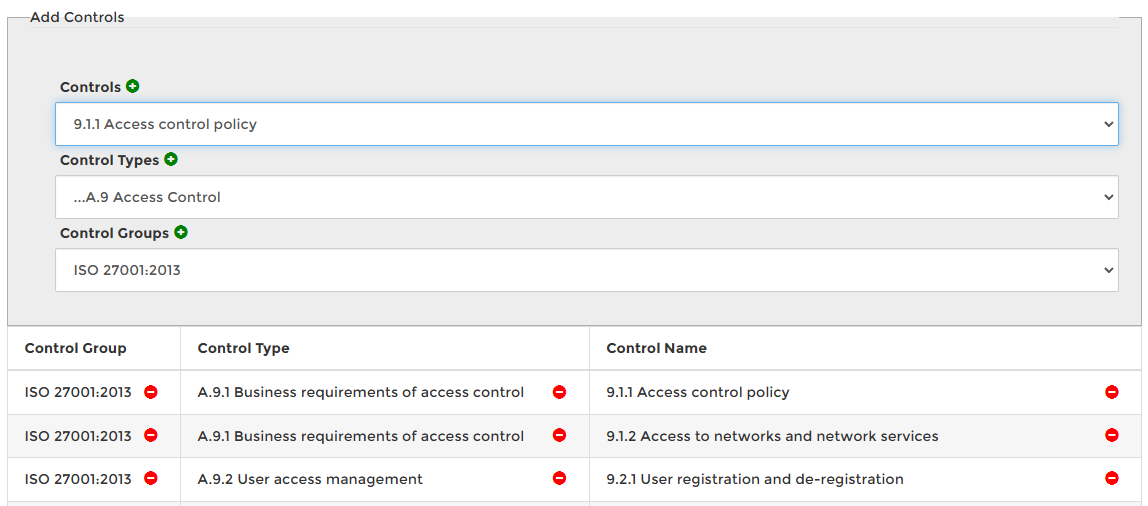 Any number of controls may be identified and linked to a process. By selecting the ‘Add Controls’ menu and selecting the drop down boxes provided it is possible to select a control, by pressing (green symbol). For efficiency, it is possible to select a complete set of controls from one ‘Control Group’, a group of nested controls, or an individual controls.