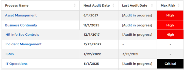 Once a process is defined, and the clauses and controls that describe compliance requirements are assigned to the process, an audit may be set up for that process by selecting the ‘Add an Audit’ from the menu bar.