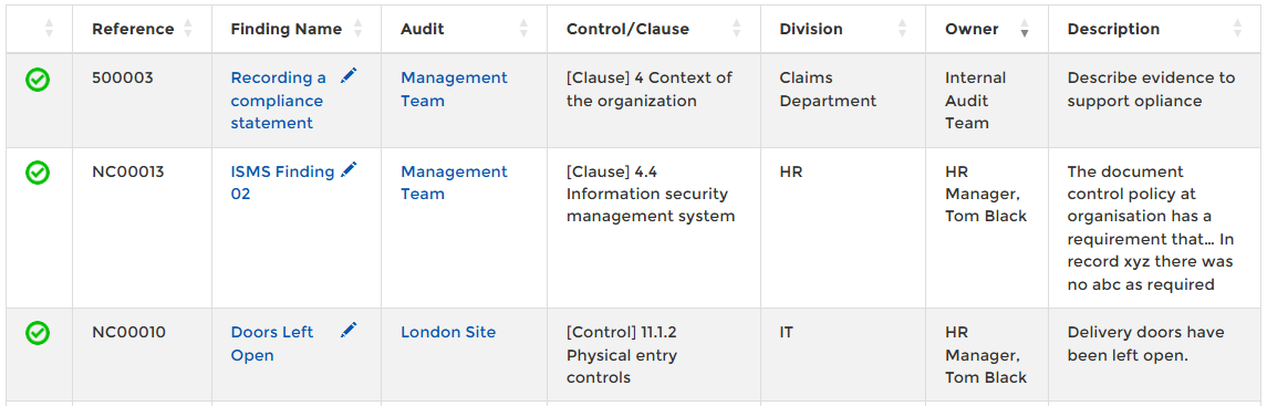 By selecting the Audit and Action Management >Audits>Audit Controls or the Audit and Action Management >Audits>Audit Clauses Menu a list of all the relevant clauses and controls will be displayed, showing whether findings have been raised, in progress or complete. By clicking on each individual clause or control, a list of the relevant findings will be displayed, allowing them to be edited and updated as appropriate. From this screen it is possible to toggle back to look at all Findings by selecting the View All Findings menu
