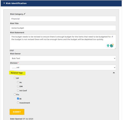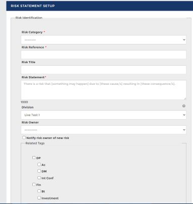 Tags will now show on the risk statement setup page. It is not mandatory for a risk to have a tag, but the option will always be available during risk set up or in the risk register.