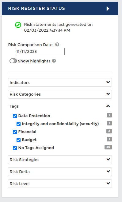 The risk register can be filtered to show the tag/risk association and allow you to identify trends. You can filter the risk register using the option at the top of the page or use the risk register status panel.